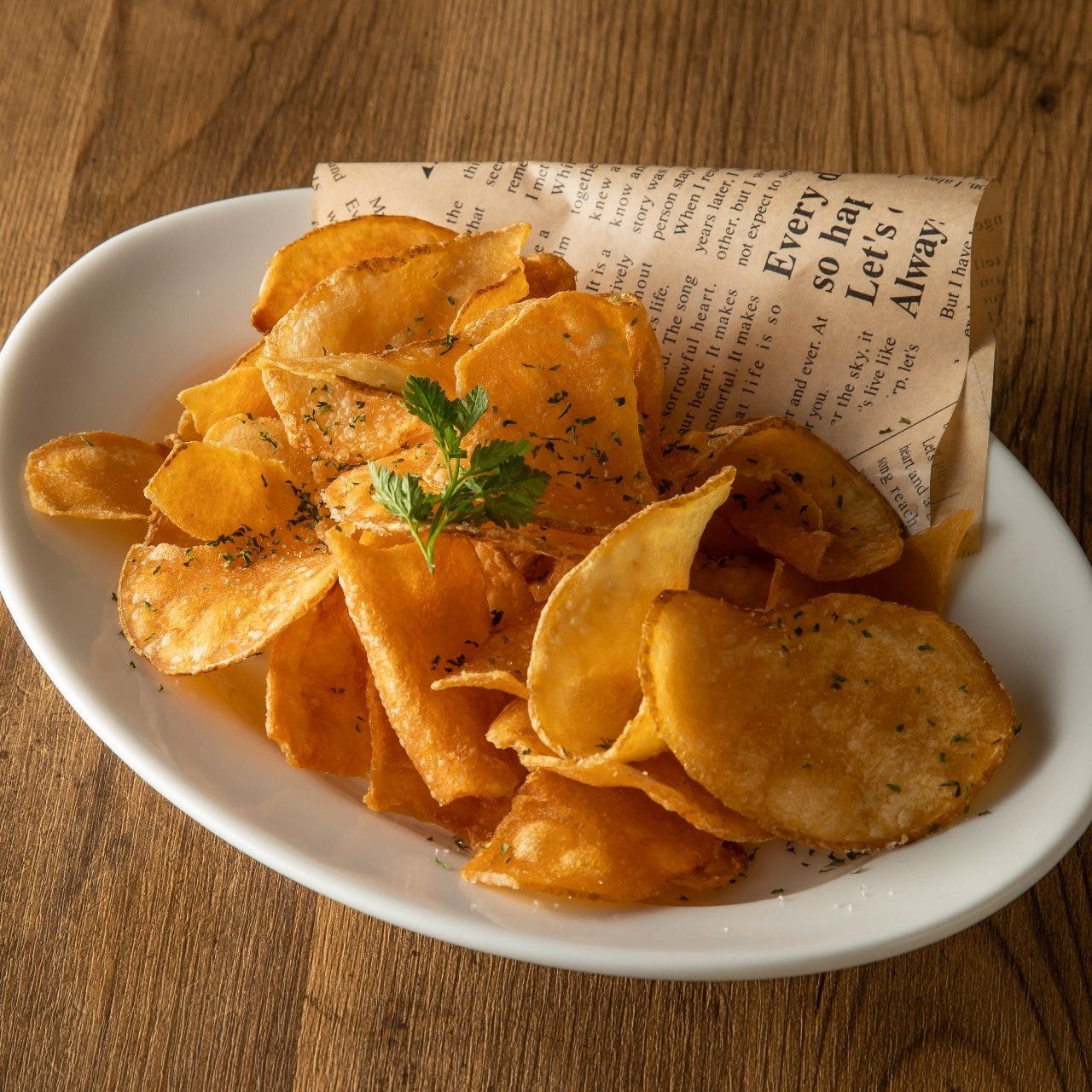 写真のメニューは「揚げたてポテトチップス」です。厚切りにしたじゃがいもをからっと揚げた人気のひと品。仲間とシェアするのにもぴったりの一押しメニューです。